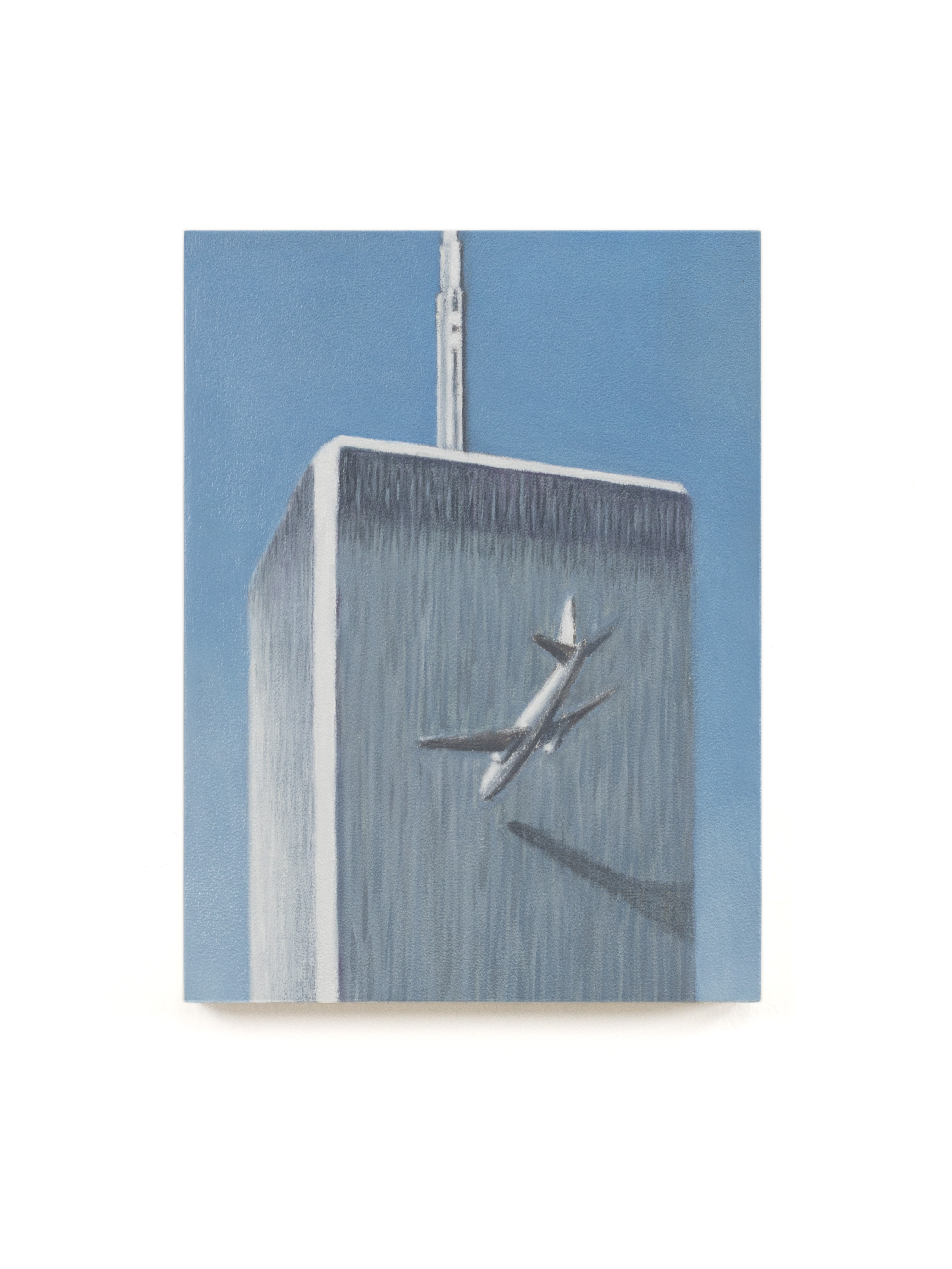 This oil painting is the third in a series based on a video clip accidentally captured by a passerby in Manhattan on September 11, 2001. It portrays the moment just before a jetliner crashes into the World Trade Center. The shaky footage, with its 25 frames per second limitation, only offers a brief and unclear glimpse of the event. Though images of this specific moment are missing, countless depictions of the aftermath dominate our memory. In this piece, the artist imagines and recreates the instant before impact. Unlike the first two works in the series, this painting is simplified, focusing only on the essential elements of the event. It was a clear Tuesday morning. A jetliner streaked across Manhattan, and in the next moment, the world was forever changed.
